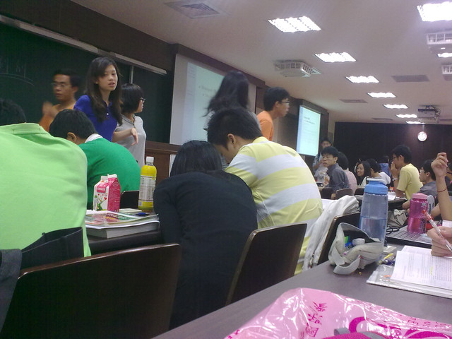 聽kevin說那個班有兩百多人,因此要早一點去教室搶位置,我們還特別早了一小時出門,避開上班車潮,8:15就到學校了。8:50到了普通教室(大型階梯教室),教室裡十個人不到,反而是教授九點鐘就到了教室不匆不忙的先準備投影片,一方面也可以讓同學問問題吧,我想。